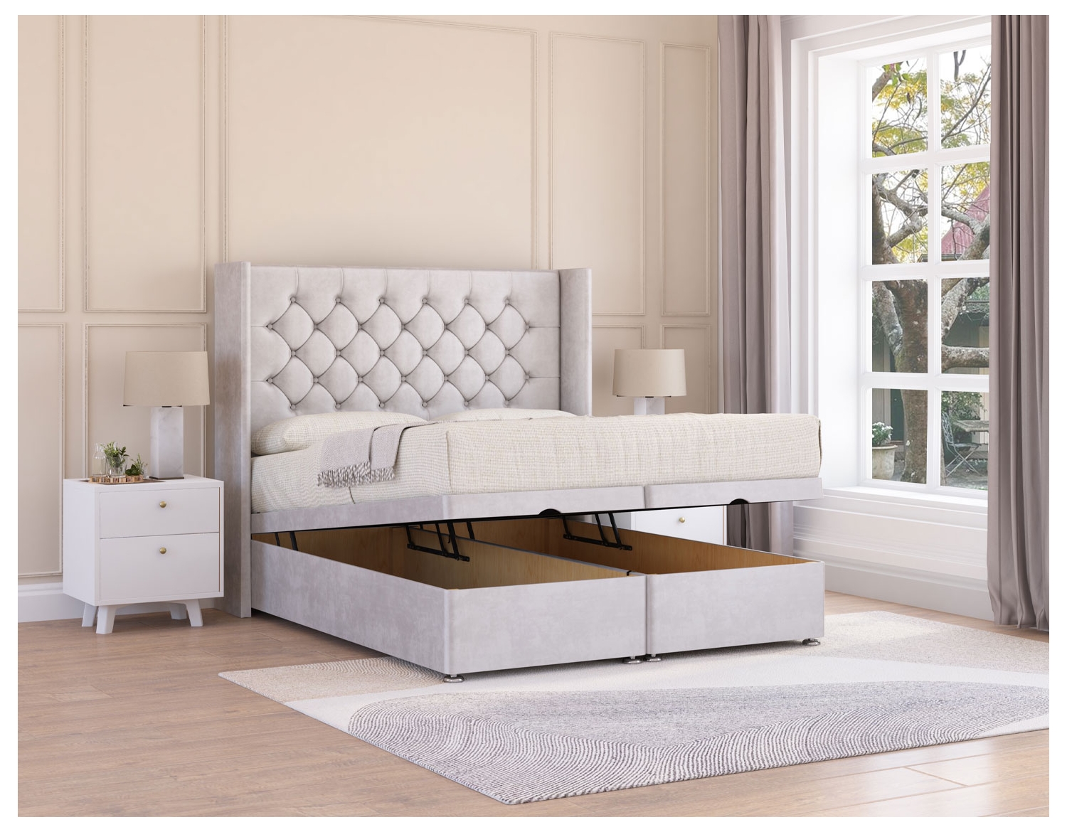 The Dior Ottoman Bed, a high-quality and luxurious storage bed that combines style and functionality. Its headboard is elegantly designed with a tufted finish and a classic chesterfield style that enhances any bedroom